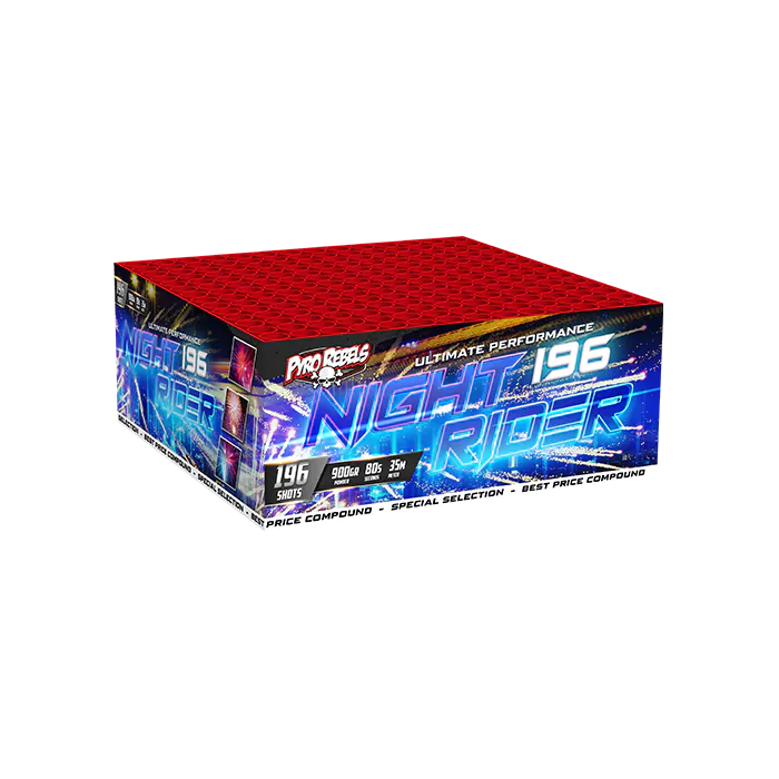NIGHT RIDER 196 SHOTS COMPOUND nBEST PRICE SELECTION NR.3 – 196 shots compound box met 900 gram kruit. n