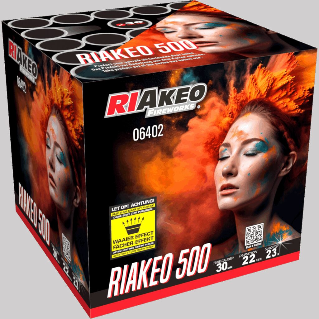 n nDe Riakeo 500 cake van Riakeo, is nu al genomineerd voor de gruwelijkste 500-grammer van Nederland! Crackling King coco met strobes en ghosts en ingebouwde waaier! Niet afwachtuh, maar haluh! Artnr: 06402. n n Riakeo Fireworks Riakeo 500 23 shots Goedkoop vuurwerk kopen bij Vuurwerkwinkel Eersel